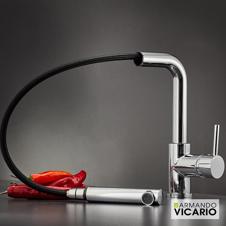 Μπαταρία νεροχύτου θερμομικτική FLUO με Περιστρεφόμενο ρουξούνι,συρόμενο ντους και άθραυστο σπιράλ VICARIO Ιταλίας.